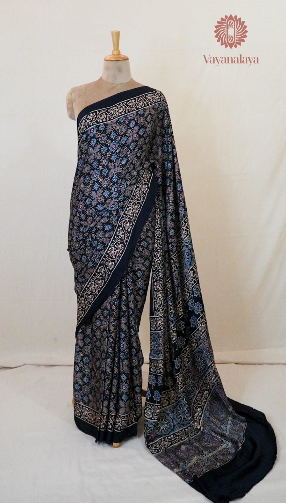 Ajrakh Handblock Print Modal Silk Saree in Black