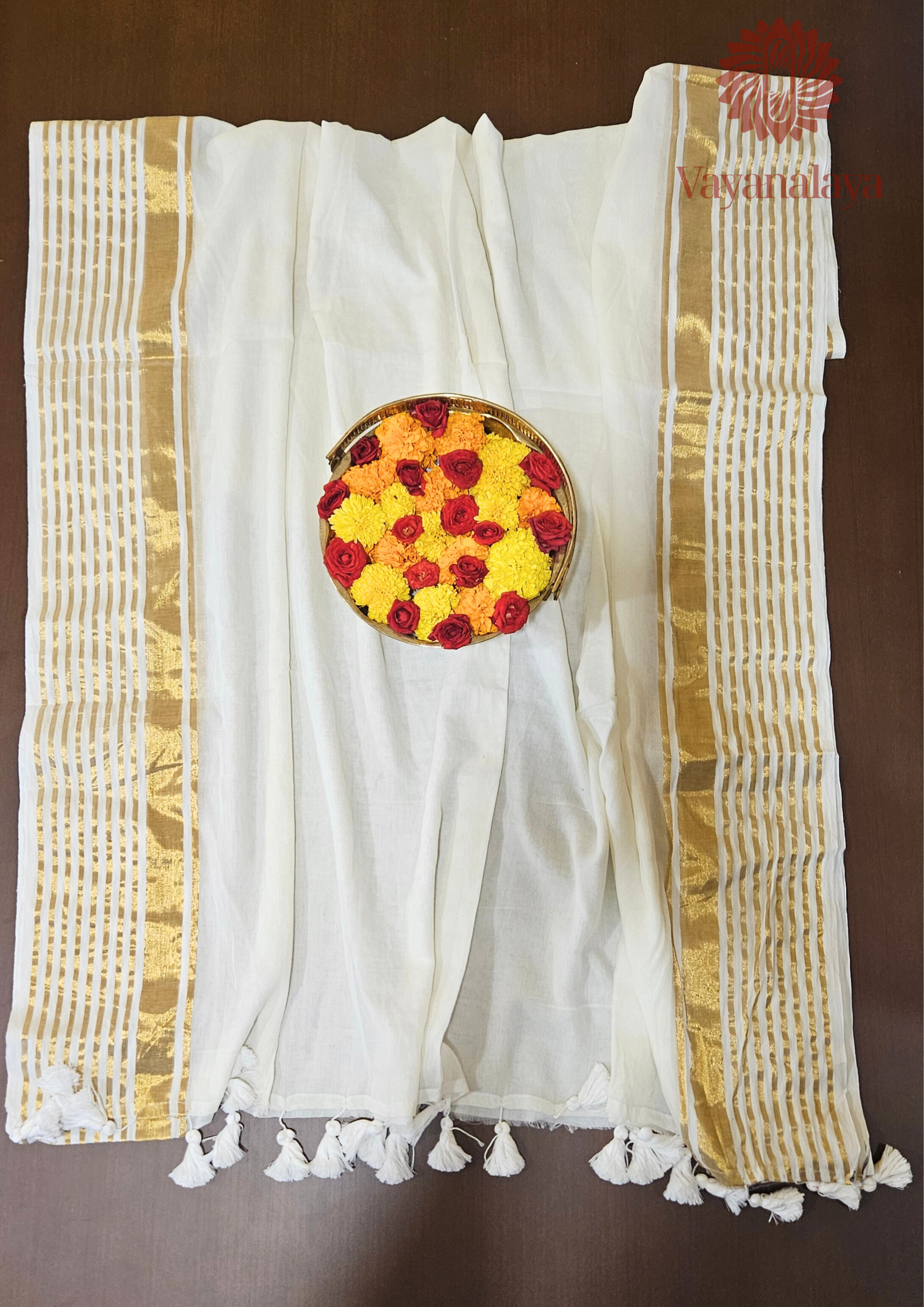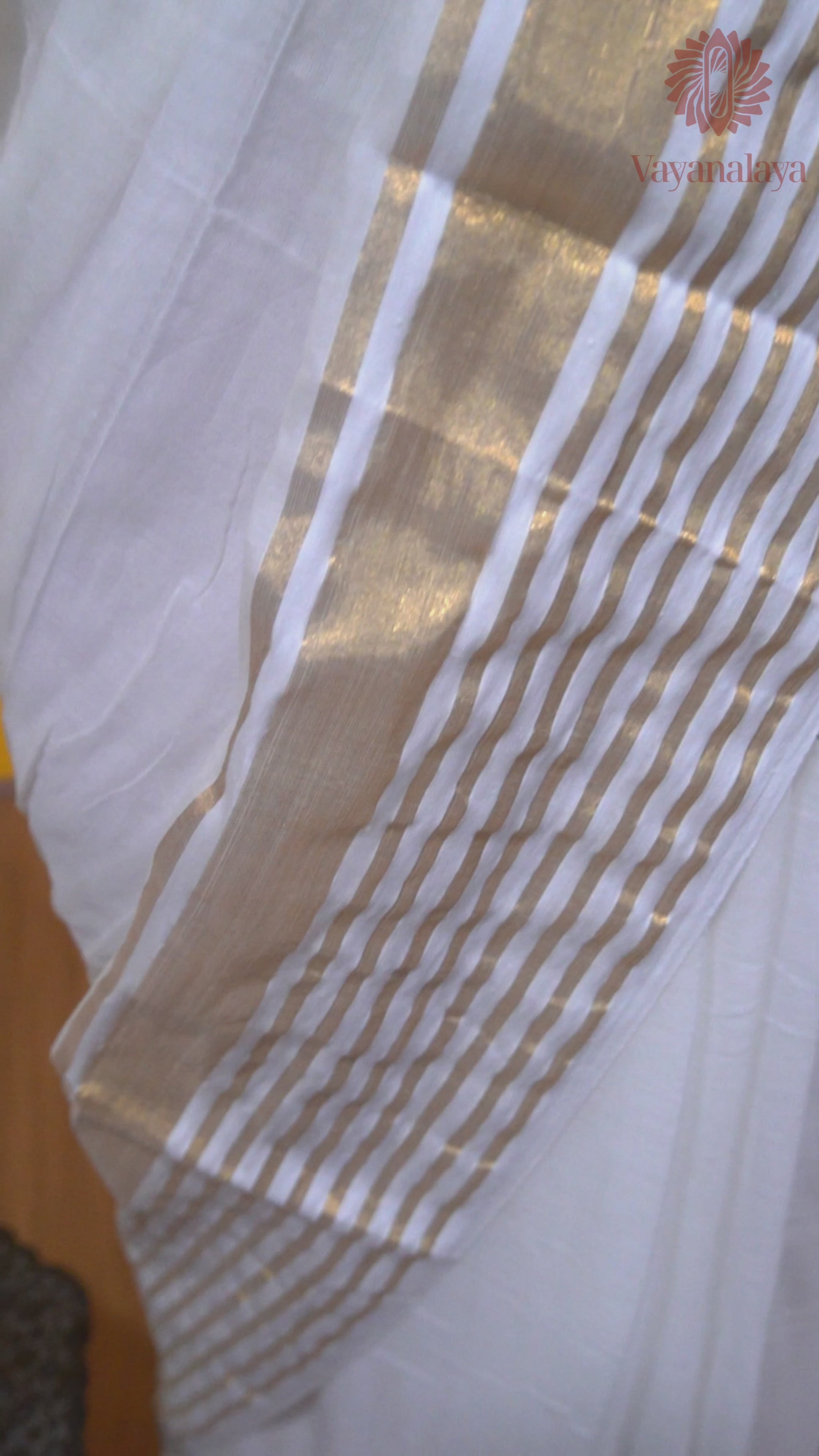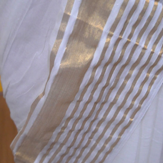 - Color: Off-white with golden striped border and pallu