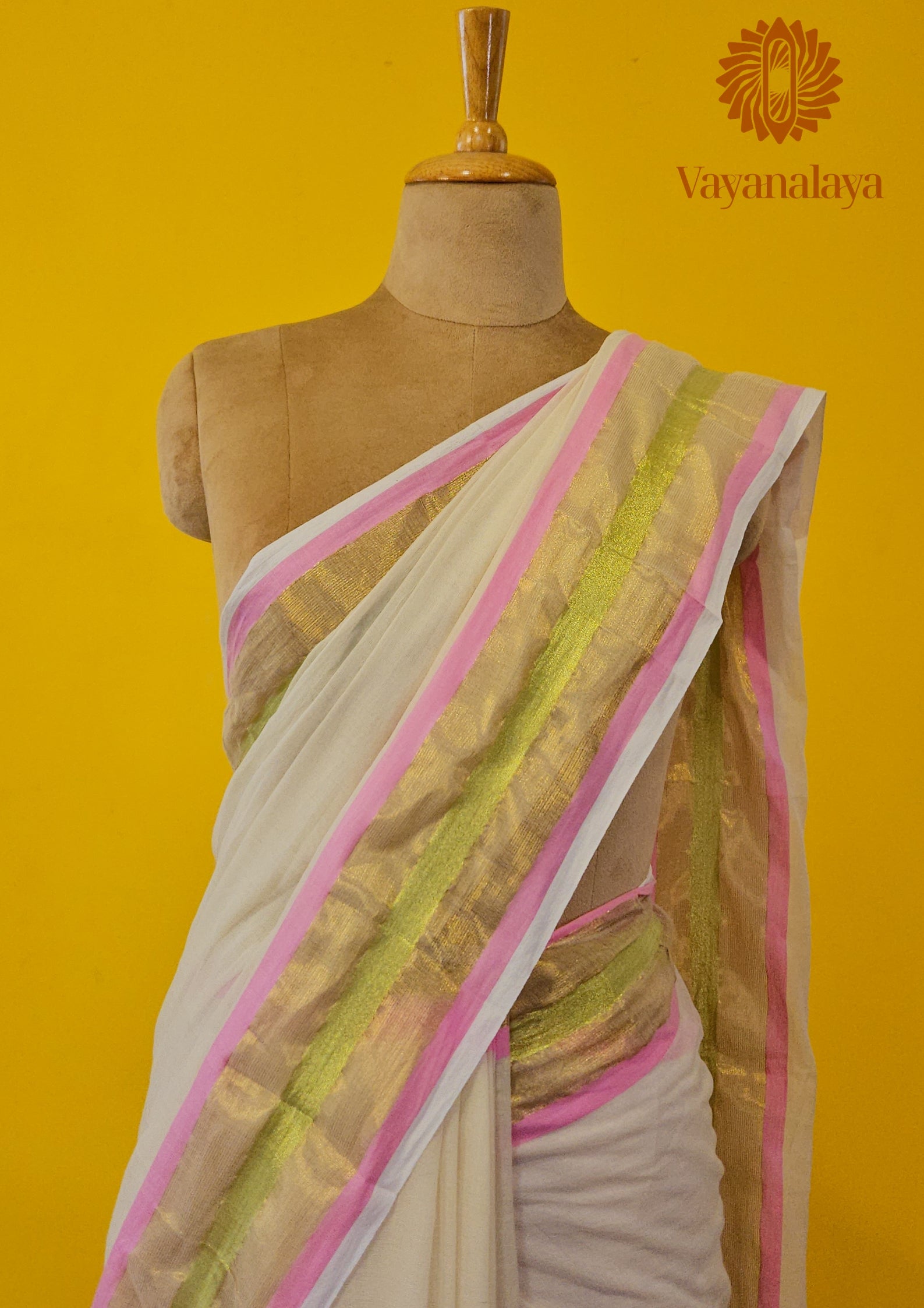 From our Onam series Chandrika, this soft, breezy off-white mull cotton saree captures the charm of festive mornings, finished with a delicate gold and pink border. Perfect for those who love comfort with a touch of tradition.