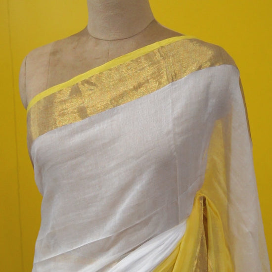 A soft handwoven mull cotton saree in an elegant half-and-half design of white and yellow, finished with a shimmering golden border. Lightweight and festive, this saree is crafted to bring a glow of tradition with a touch of ease.