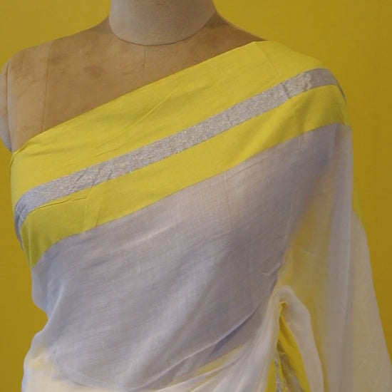 A graceful white mull cotton saree adorned with a refreshing yellow border and an elegant silver line detailing in between. Lightweight, breathable, and effortlessly charming, this saree beautifully balances tradition and modern aesthetics. Finished with playful yellow tassels, it’s a versatile drape that radiates festive cheer and everyday elegance alike.