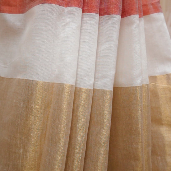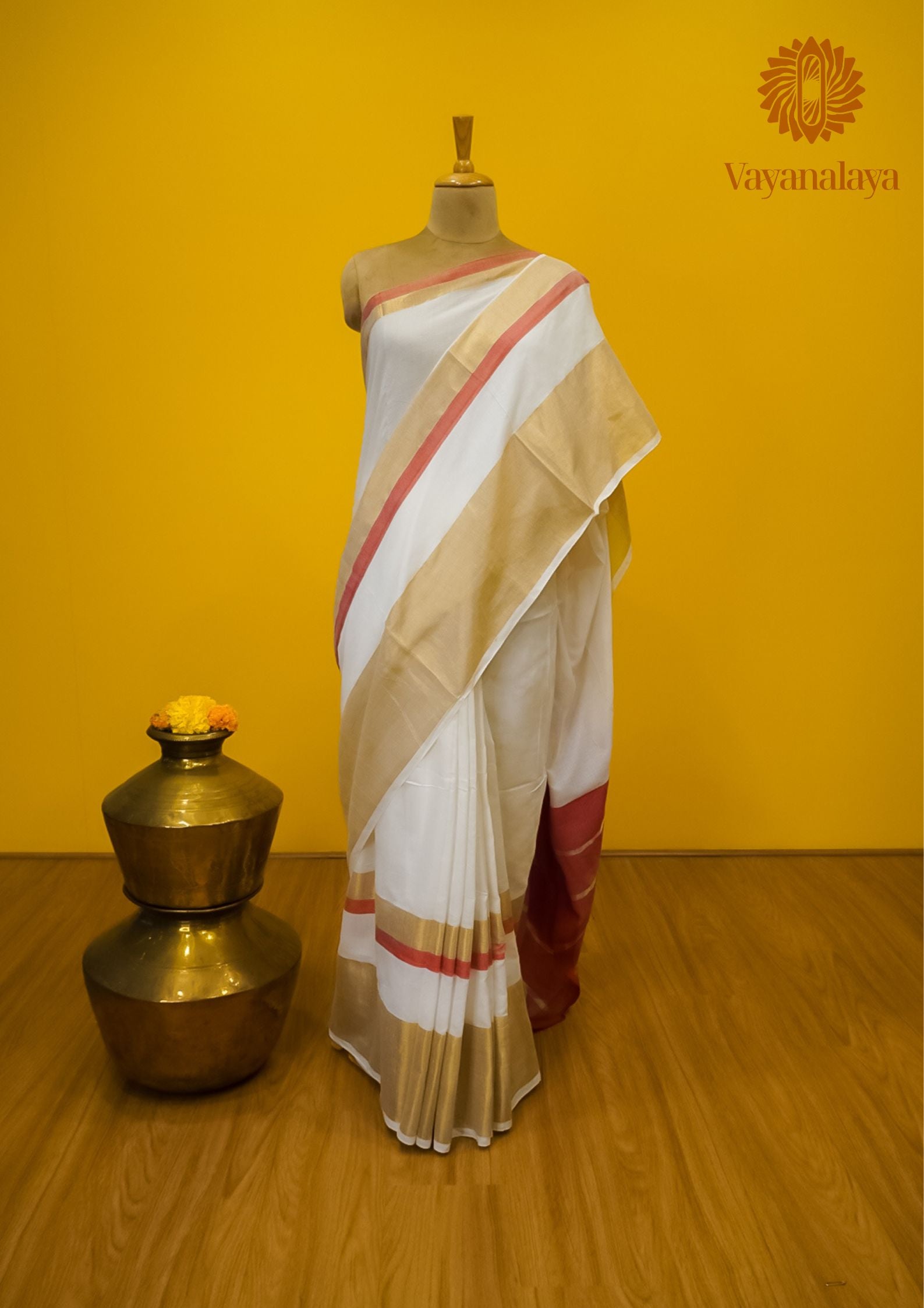 Handwoven white cotton saree featuring a gold and red zari border, along with a lovely red pallu. This saree is budget-friendly and sure to attract attention.