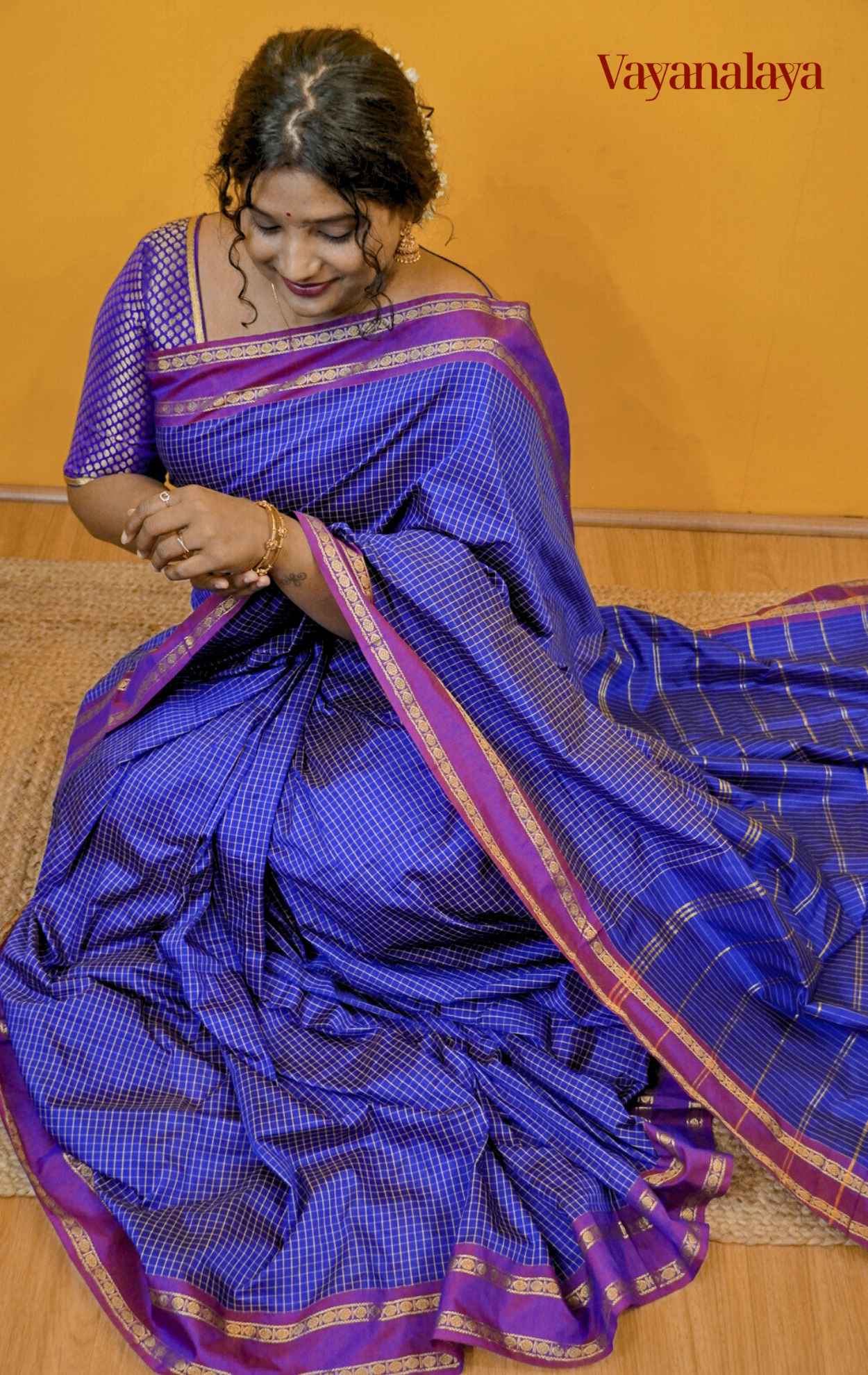 Neelambari is a striking weave in rich blue with a contrasting violet border, crafted in our signature handwoven cotton-blend. The classic kattam checks and subtle gold lines give it that quiet, old-world beauty you only find in true South Indian drapes. Soft, breathable, and elegant, this saree moves effortlessly from morning rituals to festive evenings.