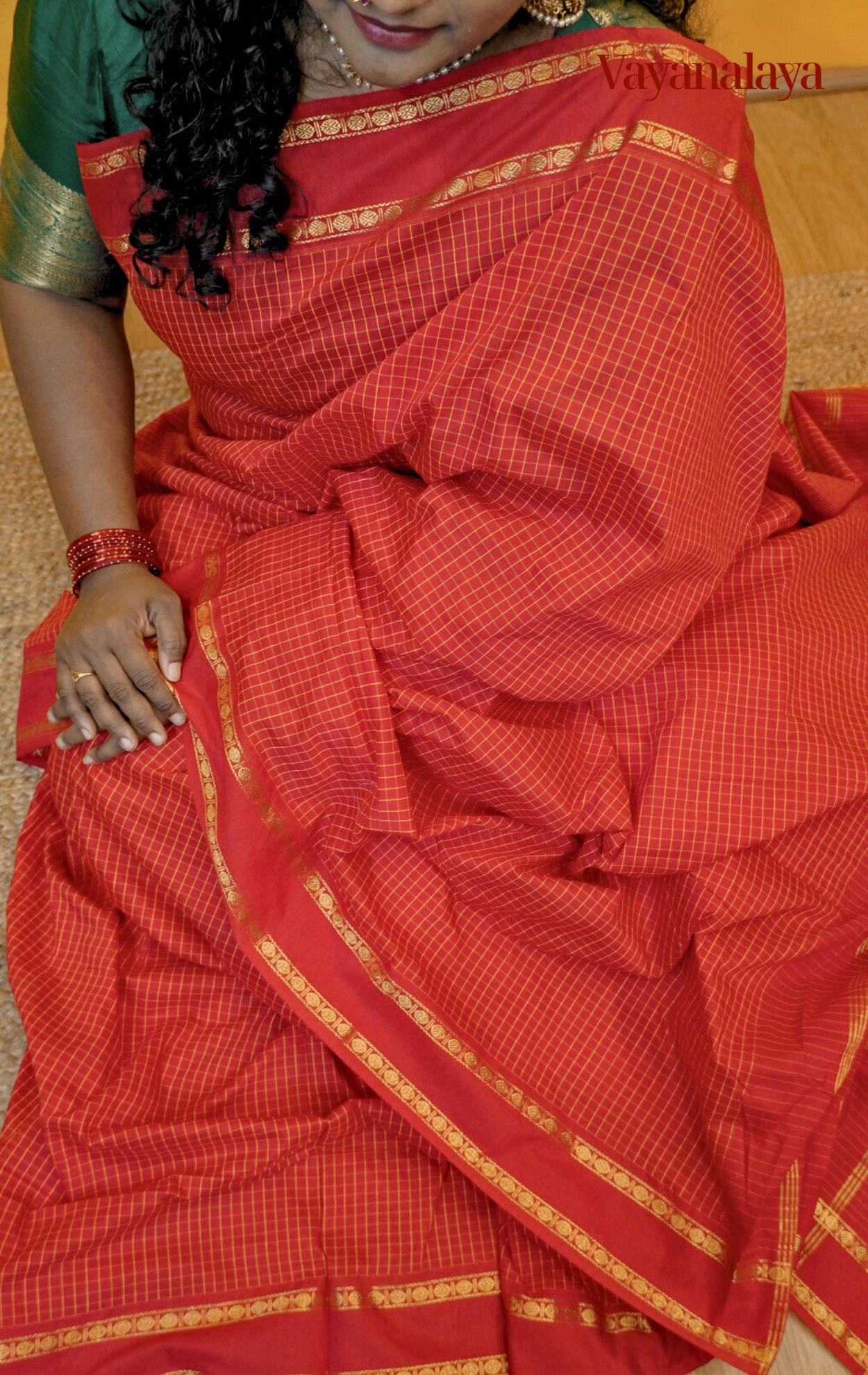 Semparuthi is a warm reddish-orange drape from our RudraKattam Collection, handwoven in a soft cotton-blend fabric with classic kattam checks. The saree is framed with a soft gold zari border featuring subtle Rudraksha-inspired detailing. Rich in colour and grounded in heritage, Semparuthi carries a quiet South Indian elegance, warm, refined, and timeless.
